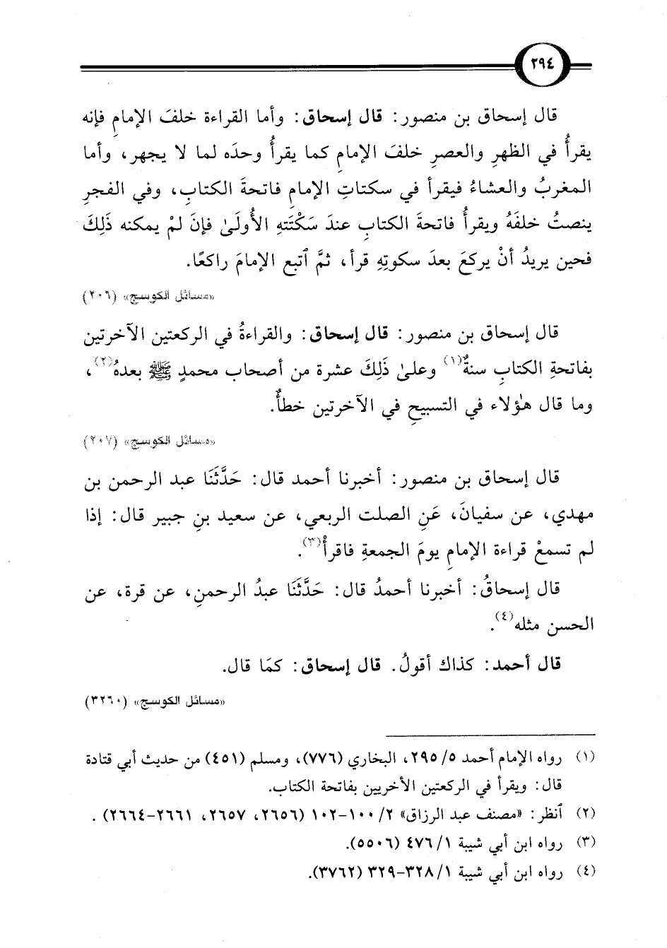 قال إسحاق بن منصور: قال إسحاق: وأما القراءة خلفَ الإمامِ فإنه يقرأُ في الظهرِ والعصرِ خلفَ الإمامِ كما يقرأُ وحدَه لما لا يجهر، وأما المغربُ والعشاءُ فيقرأ في سكتاتِ الإمامِ فاتحةَ الكتابِ، وفي الفجرِ ينصتُ خلفَهُ ويقرأُ فاتحةَ الكتابِ عندَ سَكْتَتهِ الأُولَى فإنْ لمْ يمكنه ذَلِكَ فحين يريدُ أنْ يركعَ بعدَ سكوتِهِ قرأ، ثمَّ اتبع الإمامَ راكعًا.