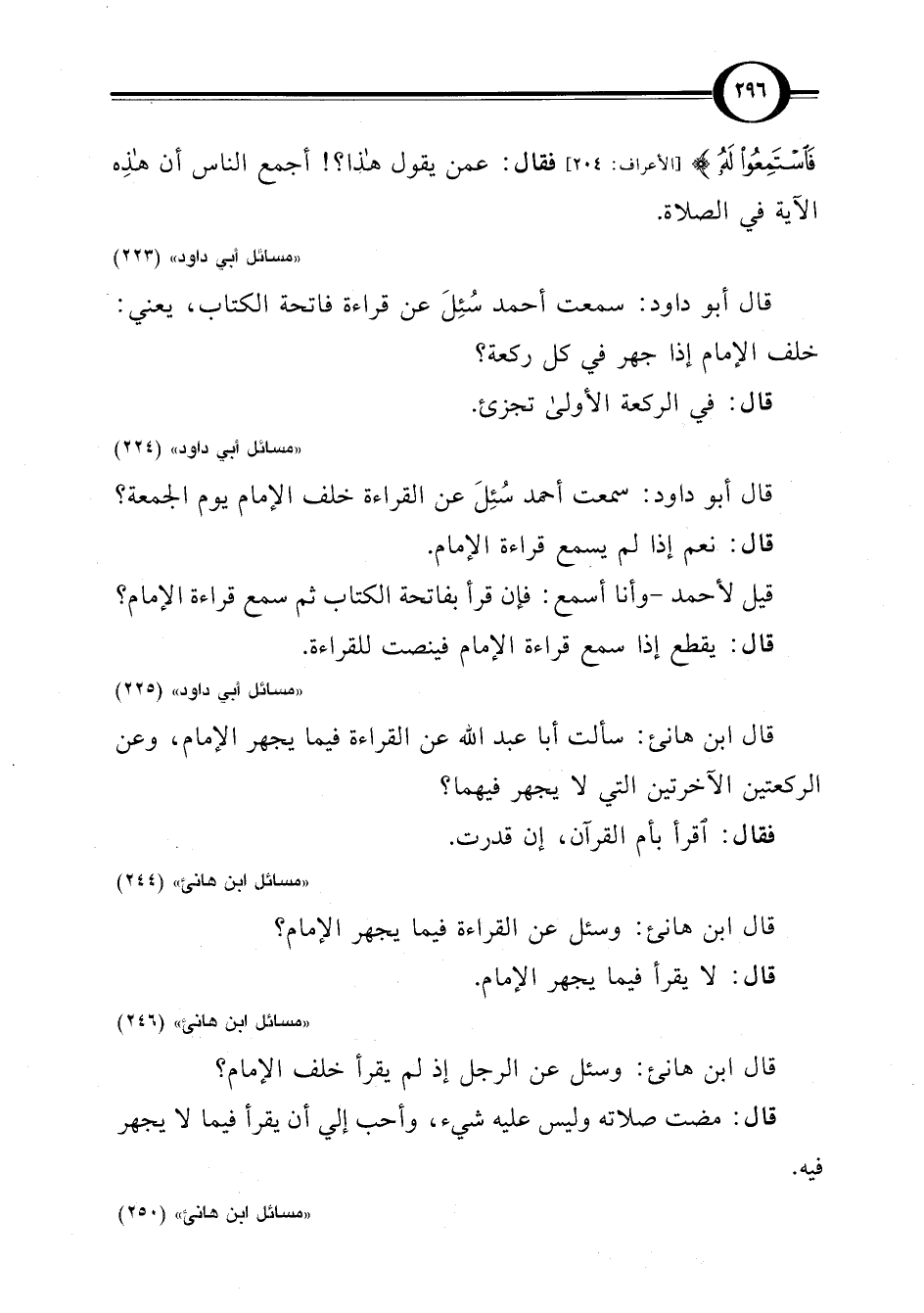 قال ابن هانئ: سألت أبا عبد اللَّه عن القراءة فيما يجهر الإمام، وعن الركعتين الآخرتين التي لا يجهر فيهما؟
