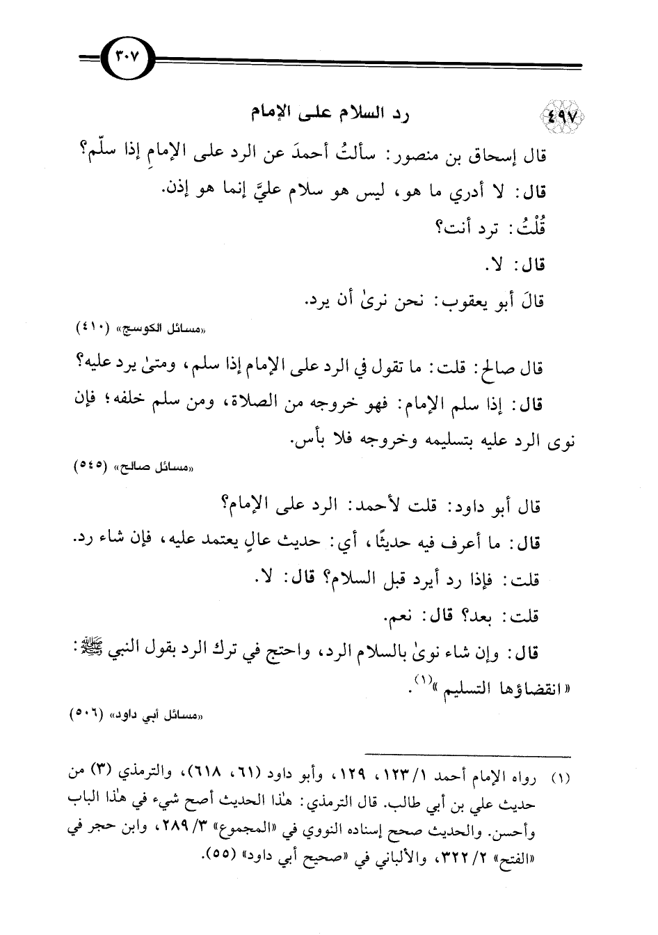 قال إسحاق بن منصور: سألتُ أحمدَ عن الرد على الإمامِ إذا سلّم؟