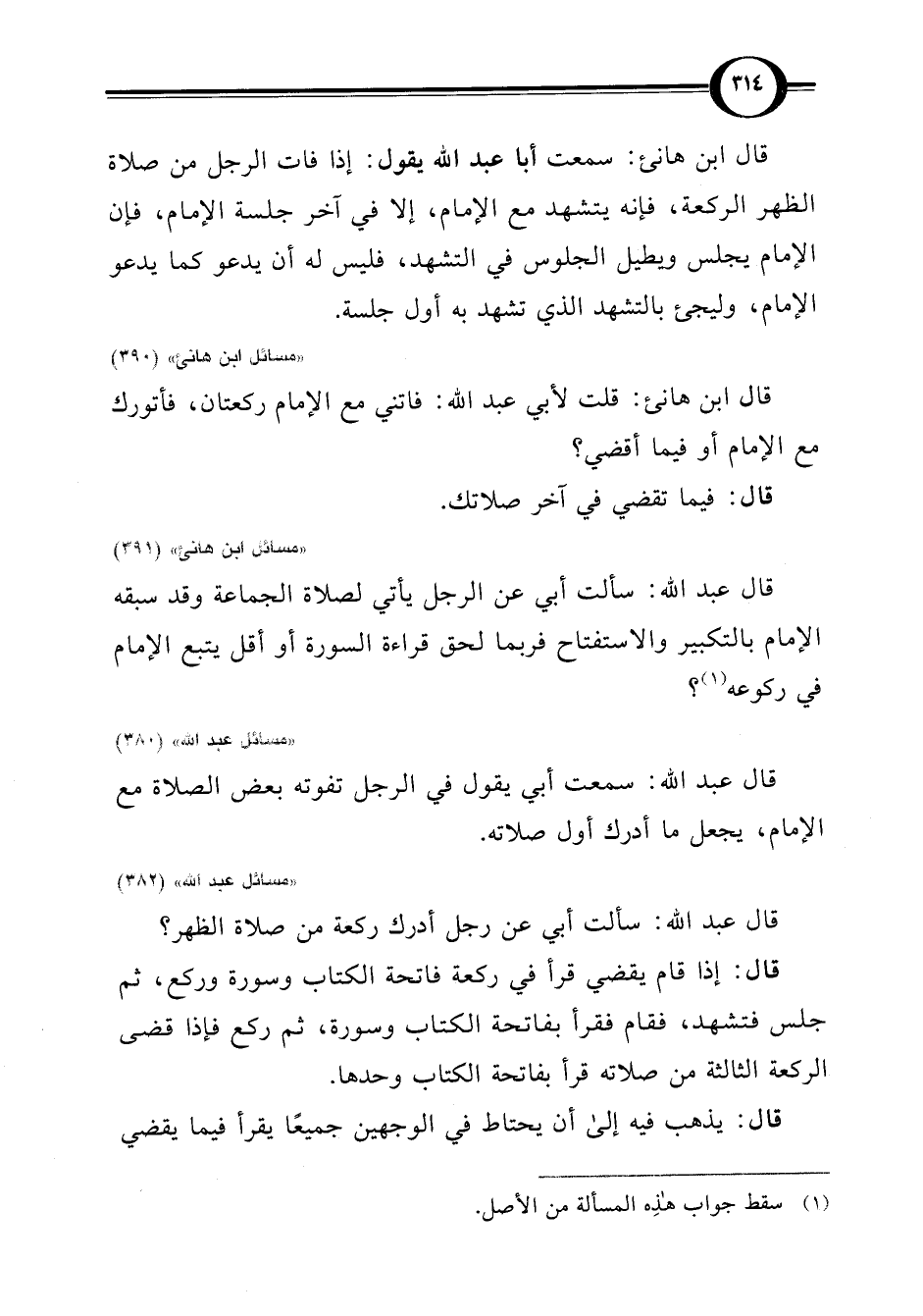 قال ابن هانئ: سمعت أبا عبد اللَّه يقول: إذا فات الرجل من صلاة الظهر الركعة، فإنه يتشهد مع الإمام، إلا في آخر جلسة الإمام، فإن الإمام يجلس ويطيل الجلوس في التشهد، فليس له أن يدعو كما يدعو الإمام، وليجئ بالتشهد الذي تشهد به أول جلسة.