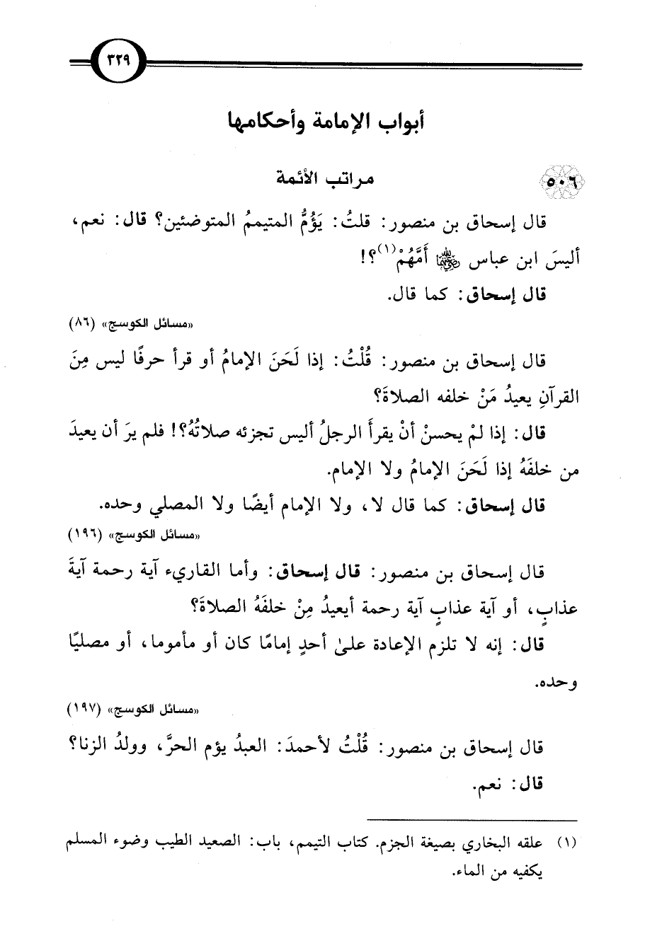 قال إسحاق بن منصور: قلتُ: يَؤُمُّ المتيممُ المتوضئين؟ قال: نعم، أليسَ ابن عباس -رضي اللَّه عنهما- أَمَّهُمْ (¬1)؟ !