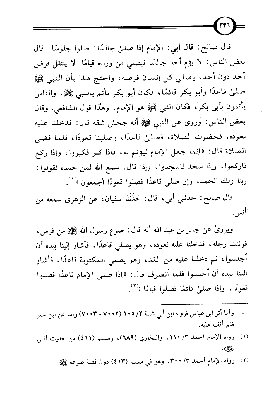 قال صالح: قال أبي: الإمام إذا صلى جالسًا: صلوا جلوسًا: قال بعض الناس: لا يؤم أحد جالسًا فيصلي من وراءه قيامًا. لا ينتقل فرض أحد دون أحد، يصلي كل إنسان فرضه، واحتج هذا بأن النبي -صلى اللَّه عليه وسلم- صلى قاعدًا وأبو بكر قائمًا، فكان أبو بكر يأتم بالنبي -صلى اللَّه عليه وسلم-، والناس يأتمون بأبي بكر، فكان النبي -صلى اللَّه عليه وسلم- هو الإمام، وهذا قول الشافعي. وقال بعض الناس: وروي عن النبي -صلى اللَّه عليه وسلم- أنه جحش شقه قال: فدخلنا عليه نعوده، فحضرت الصلاة، فصلى قاعدًا، وصلينا قعودًا، فلما قضى الصلاة قال: "إنما جعل الإمام ليؤتم به، فإذا كبر فكبروا، وإذا ركع فاركعوا، وإذا سجد فاسجدوا، وإذا قال: سمع اللَّه لمن حمده فقولوا: ربنا ولك الحمد، وإن صلى قاعدًا فصلوا قعودًا أجمعون" (¬1).