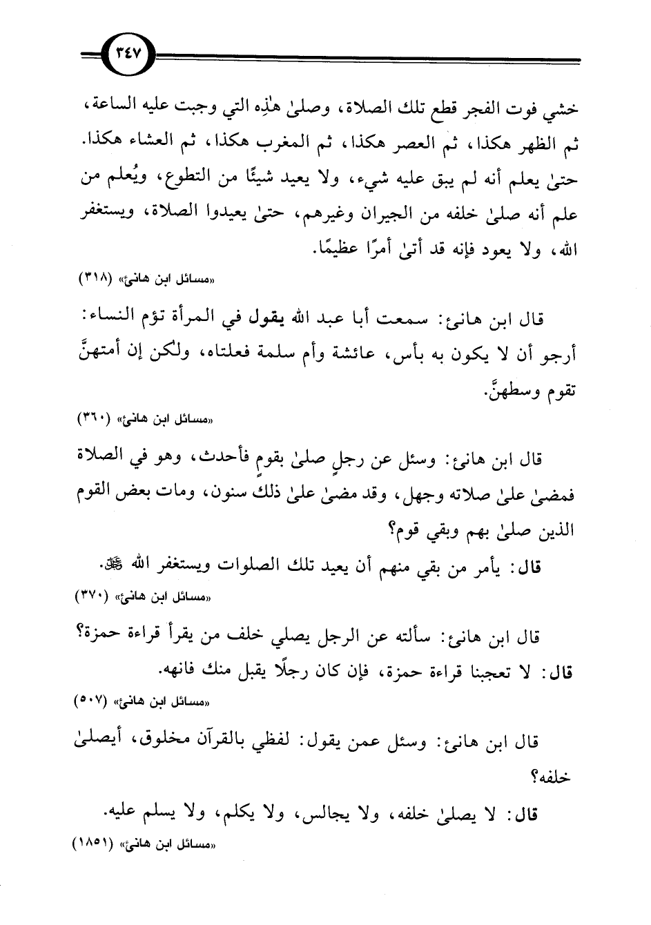 قال ابن هانئ: وسئل عمن يقول: لفظي بالقرآن مخلوق، أيصلى خلفه؟