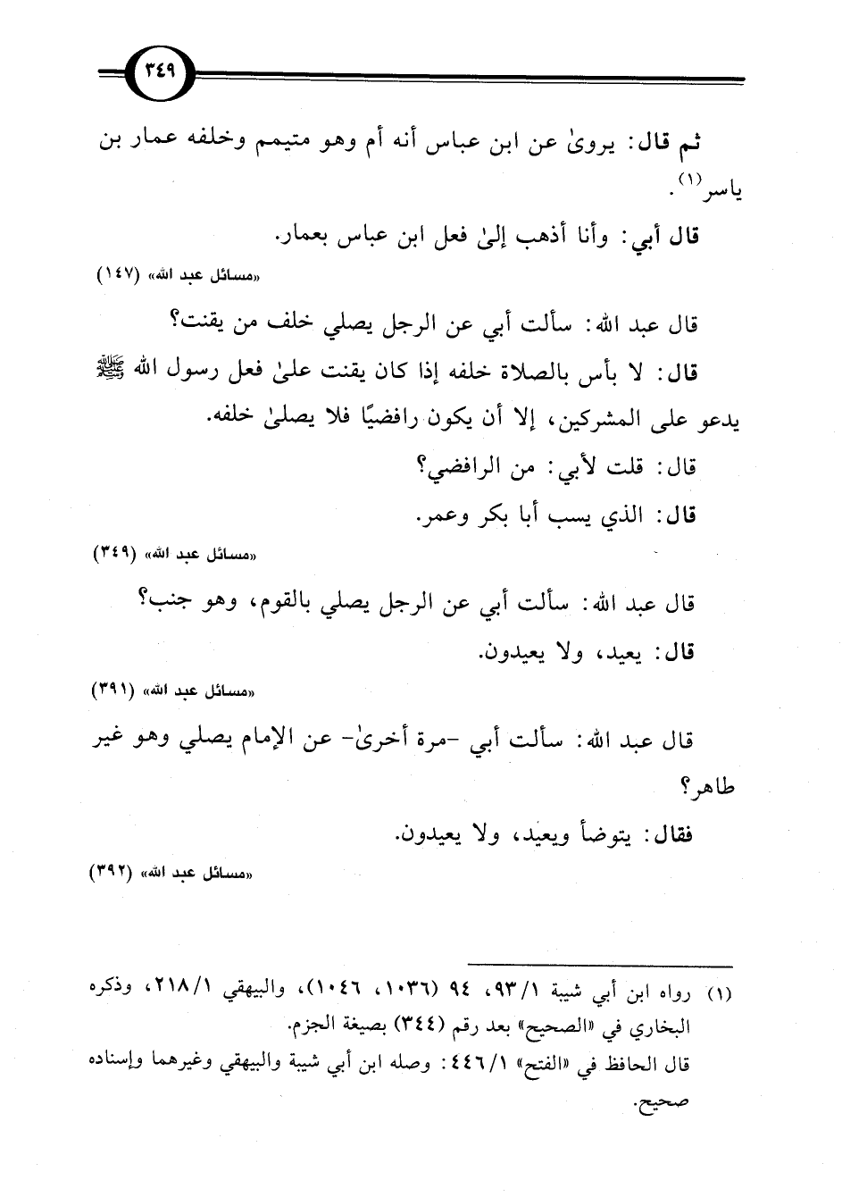 قال عبد اللَّه: سألت أبي -مرة أخرى- عن الإمام يصلي وهو غير طاهر؟