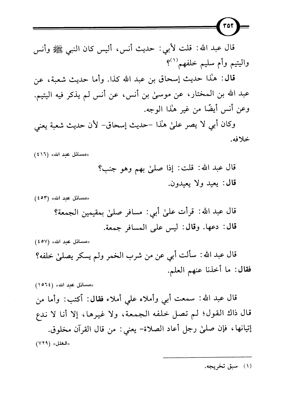 قال عبد اللَّه: سمعت أبي وأملاه علي أملاء فقال: اكتب: وأما من قال ذاك القول؛ لم تصل خلفه الجمعة، ولا غيرها، إلا أنا لا ندع إتيانها، فإن صلى رجل أعاد الصلاة -يعني: من قال القرآن مخلوق.