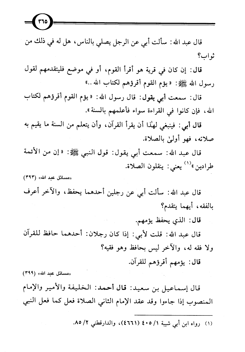 قال أبي: فينبغي لهذا أن يقرأ القرآن، وأن يتعلم من السنة ما يقيم به صلاته، فهو أولى بالصلاة.