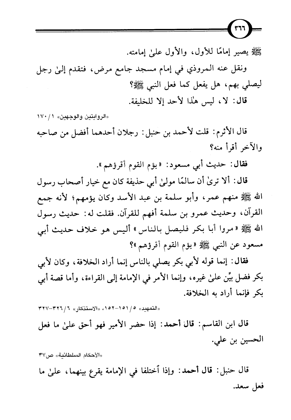 فقال: إنما قوله لأبي بكر يصلي بالناس إنما أراد الخلافة، وكان لأبي بكر فضل بيِّن على غيره، وإنما الأمر في الإمامة إلى القراءة، وأما قصة أبي بكر فإنما أراد به الخلافة.