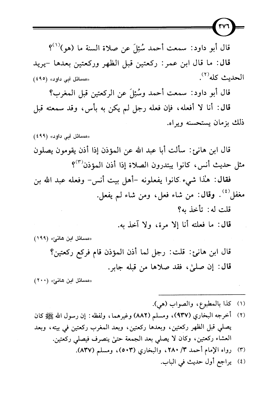 قال أبو داود: سمعت أحمد سُئِلَ عن صلاة السنة ما (هو) (¬1)؟