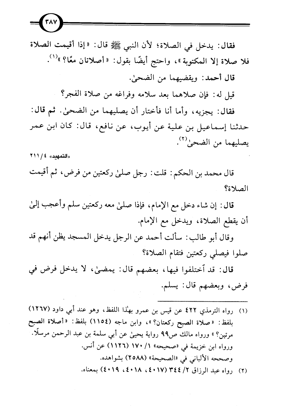 (¬1) رواه الترمذي 422 عن قيس بن عمرو بهذا اللفظ، وهو عند أبي داود (1267) بلفظ: " صلاة الصبح ركعتان؟ "، وابن ماجه (1154) بلفظ: "أصلاة الصبح مرتين؟ " ورواه مالك ص 99 رواية يحيى عن أبي سلمة بن عبد الرحمن مرسلًا.