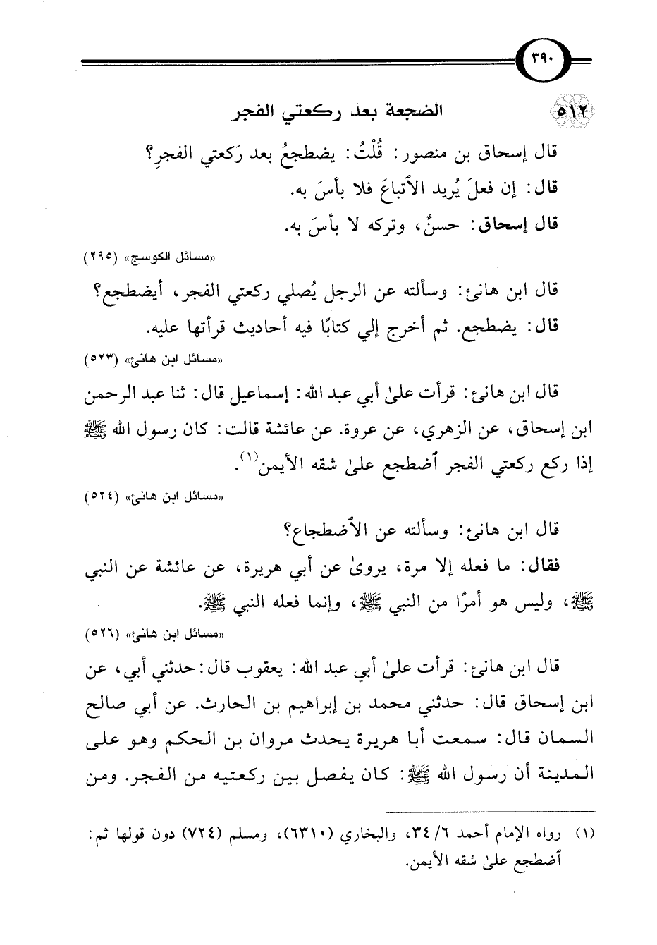 قال إسحاق بن منصور: قُلْتُ: يضطجعُ بعد رَكعتي الفجرِ؟