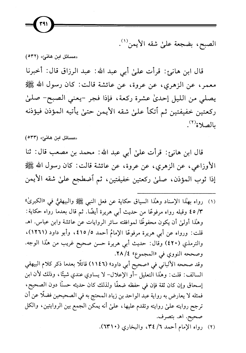 قال ابن هانئ: قرأت على أبي عبد اللَّه: عبد الرزاق قال: أخبرنا معمر، عن الزهري، عن عروة، عن عائشة قالت: كان رسول اللَّه -صلى اللَّه عليه وسلم- يصلي من الليل إحدى عشرة ركعة، فإذا فجر -يعني الصبح- صلى ركعتين خفيفتين ثم اتكأ على شقه الأيمن حتى يأتيه المؤذن فيؤذنه بالصلاة (¬2).