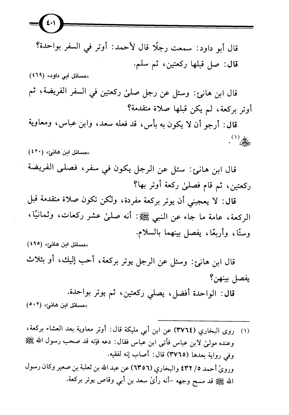 قال أبو داود: سمعت رجلًا قال لأحمد: أوتر في السفر بواحدة؟