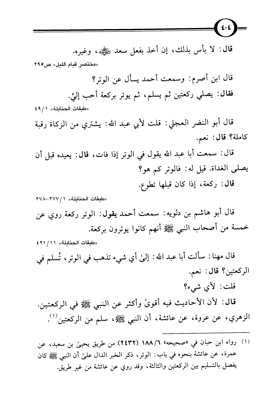 قال مهنا: سألت أبا عبد اللَّه: إلى أي شيء تذهب في الوتر، تُسلم في الركعتين؟ قال: نعم.