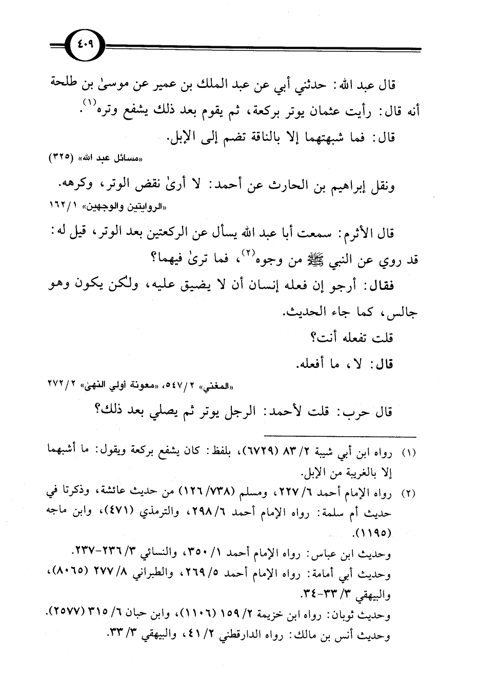 قال عبد اللَّه: حدثني أبي عن عبد الملك بن عمير عن موسى بن طلحة أنه قال: رأيت عثمان يوتر بركعة، ثم يقوم بعد ذلك يشفع وتره (¬1).