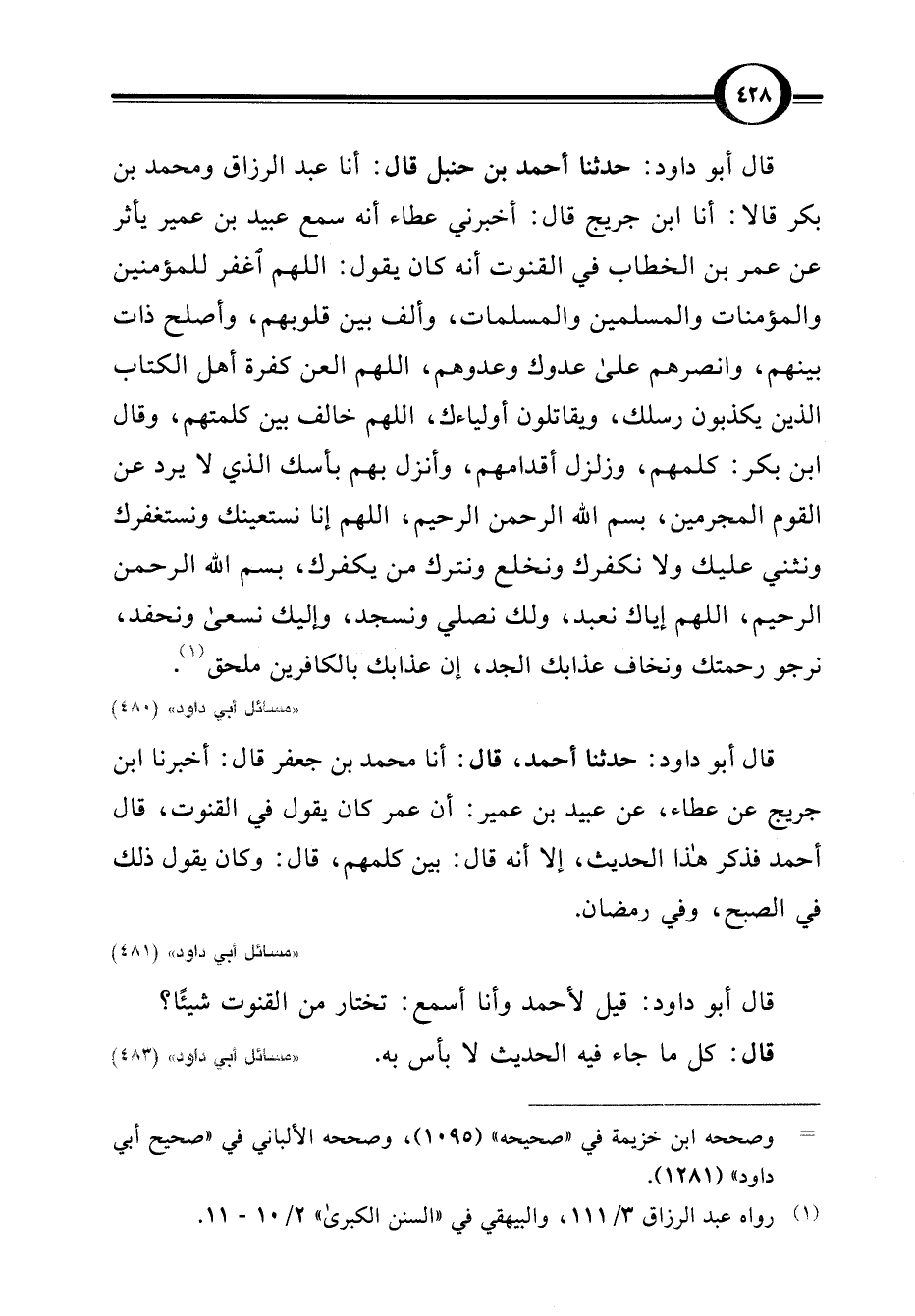 قال أبو داود: حدثنا أحمد بن حنبل قال: أنا عبد الرزاق ومحمد بن بكر قالا: أنا ابن جريج قال: أخبرني عطاء أنه سمع عبيد بن عمير يأثر عن عمر بن الخطاب في القنوت أنه كان يقول: اللهم اغفر للمؤمنين والمؤمنات والمسلمين والمسلمات، وألف بين قلوبهم، وأصلح ذات بينهم، وانصرهم على عدوك وعدوهم، اللهم العن كفرة أهل الكتاب الذين يكذبون رسلك، ويقاتلون أولياءك، اللهم خالف بين كلمتهم، وقال ابن بكر: كلمهم، وزلزل أقدامهم، وأنزل بهم بأسك الذي لا يرد عن القوم المجرمين، بسم اللَّه الرحمن الرحيم، اللهم إنا نستعينك ونستغفرك ونثني عليك ولا نكفرك ونخلع ونترك من يكفرك، بسم اللَّه الرحمن الرحيم، اللهم إياك نعبد، ولك نصلي ونسجد، وإليك نسعى ونحفد، نرجو رحمتك ونخاف عذابك الجد، إن عذابك بالكافرين ملحق (¬1).