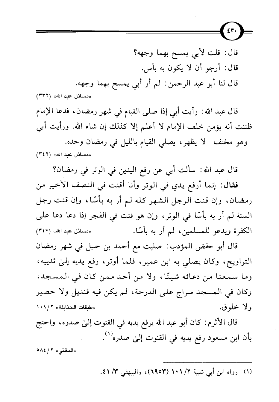 قال أبو حفض المؤدب: صليت مع أحمد بن حنبل في شهر رمضان التراويح، وكان يصلي به ابن عمير، فلما أوتر، رفع يديه إلى ثدييه، وما سمعنا من دعائه شيئًا، ولا من أحد ممن كان في المسجد، وكان في المسجد سراج على الدرجة، لم يكن فيه قنديل ولا حصير ولا خلوق.