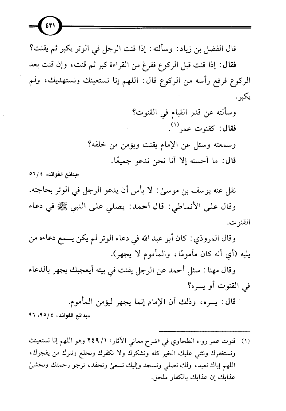 (¬1) قنوت عمر رواه الطحاوي في "شرح معاني الآثار" 1/ 249 وهو اللهم إنا نستعينك ونستغفرك ونثني عليك الخير كله ونشكرك ولا نكفرك ونخلع ونترك من يفجرك، اللهم إياك نعبد، ولك نصلي ونسجد وإليك نسعى ونحفد، نرجو رحمتك ونخشى عذابك إن عذابك بالكفار ملحق.