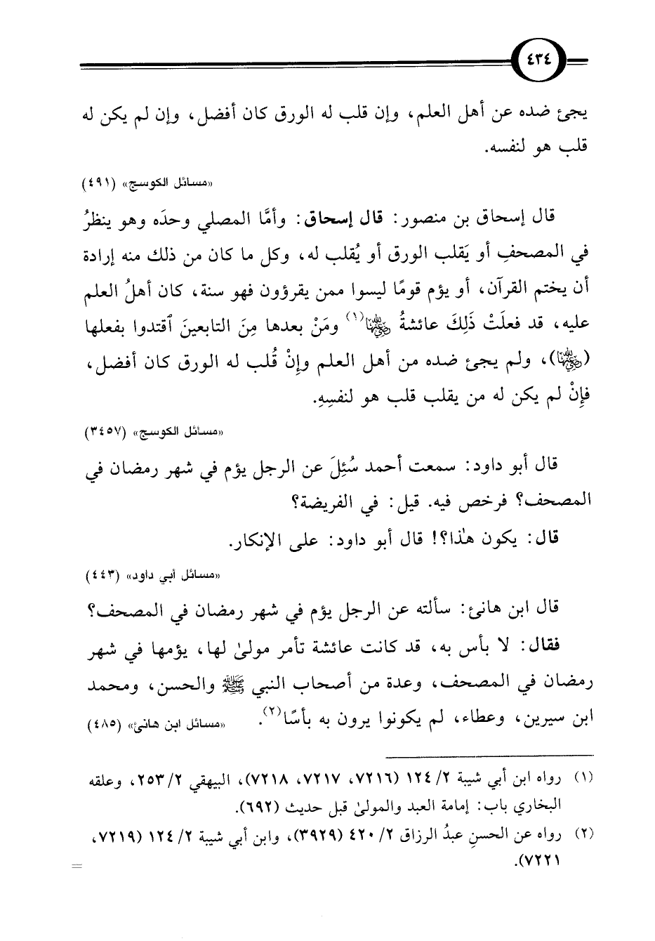 قال إسحاق بن منصور: قال إسحاق: وأمَّا المصلي وحدَه وهو ينظرُ في المصحفِ أو يَقلب الورق أو يُقلب له، وكل ما كان من ذلك منه إرادة أن يختم القرآن، أو يؤم قومًا ليسوا ممن يقرؤون فهو سنة، كان أهلُ العلم عليه، قد فعلَتْ ذَلِكَ عائشةُ -رضي اللَّه عنها- (¬1) ومَنْ بعدها مِنَ التابعينَ اقتدوا بفعلها (-رضي اللَّه عنها-)، ولم يجئ ضده من أهل العلم وإنْ قُلب له الورق كان أفضل، فإِنْ لم يكن له من يقلب قلب هو لنفسِهِ.