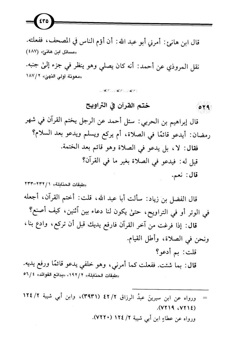 قال إبراهيم بن الحربي: سئل أحمد عن الرجل يختم القرآن في شهر رمضان: أيدعو قائمًا في الصلاة، أم يركع ويسلم ويدعو بعد السلام؟