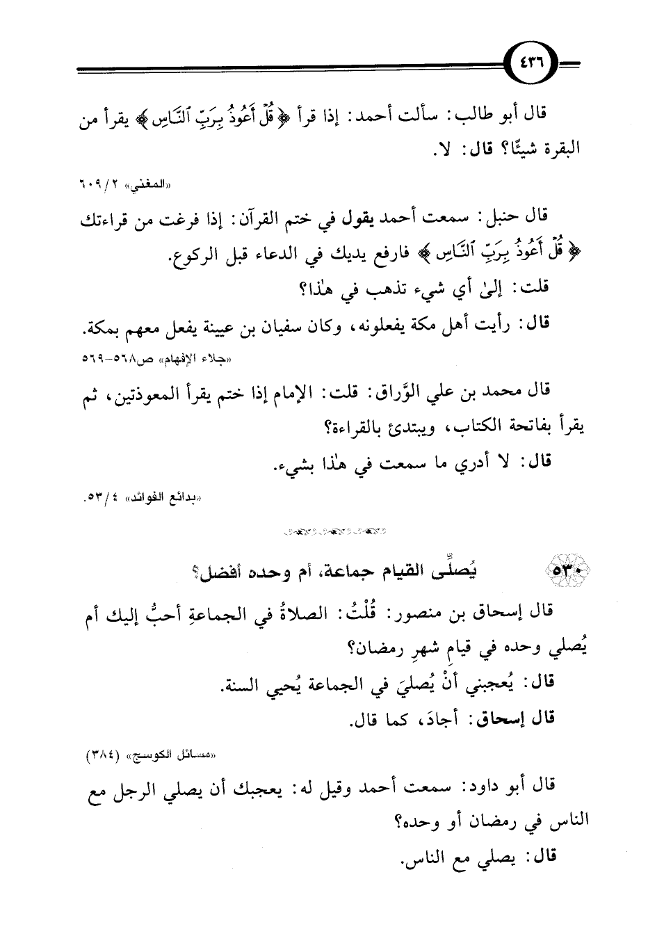 قال أبو طالب: سألت أحمد: إذا قرأ {قُلْ أَعُوذُ بِرَبِّ النَّاسِ} يقرأ من البقرة شيئًا؟ قال: لا.