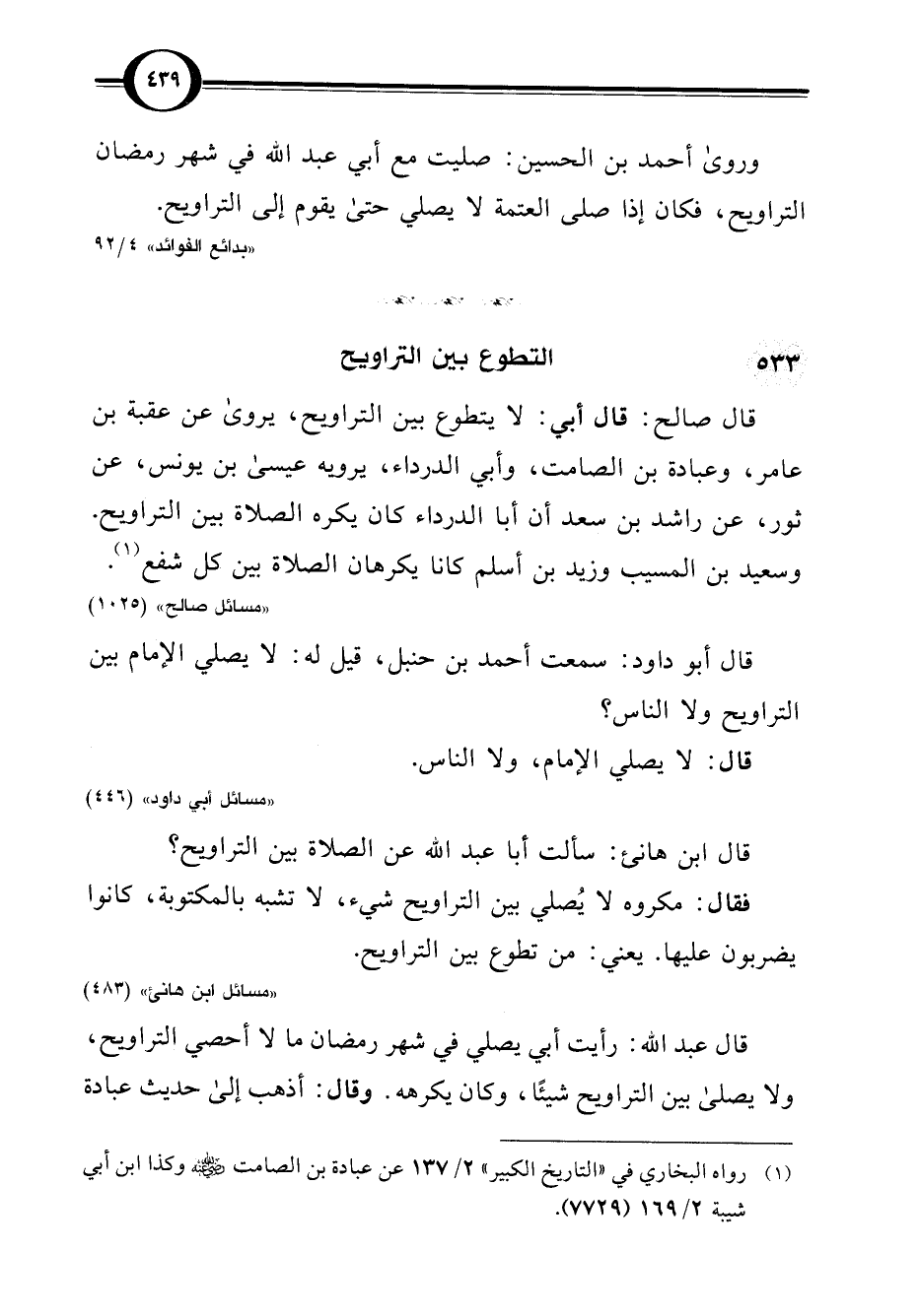 قال صالح: قال أبي: لا يتطوع بين التراويح، يروى عن عقبة بن عامر، وعبادة بن الصامت، وأبي الدرداء، يرويه عيسى بن يونس، عن ثور، عن راشد بن سعد أن أبا الدرداء كان يكره الصلاة بين التراويح. وسعيد بن المسيب وزيد بن أسلم كانا يكرهان الصلاة بين كل شفع (¬1).