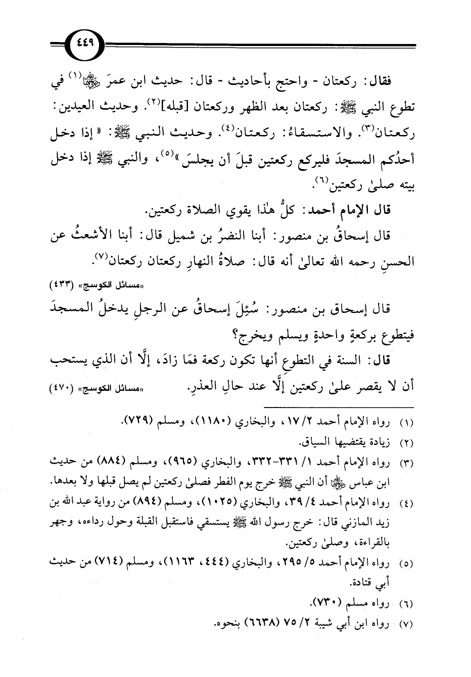 (¬3) رواه الإمام أحمد 1/ 331 - 332، والبخاري (965)، ومسلم (884) من حديث ابن عباس -رضي اللَّه عنهما- أن النبي -صلى اللَّه عليه وسلم- خرج يوم الفطر فصلى ركعتين لم يصل قبلها ولا بعدها.