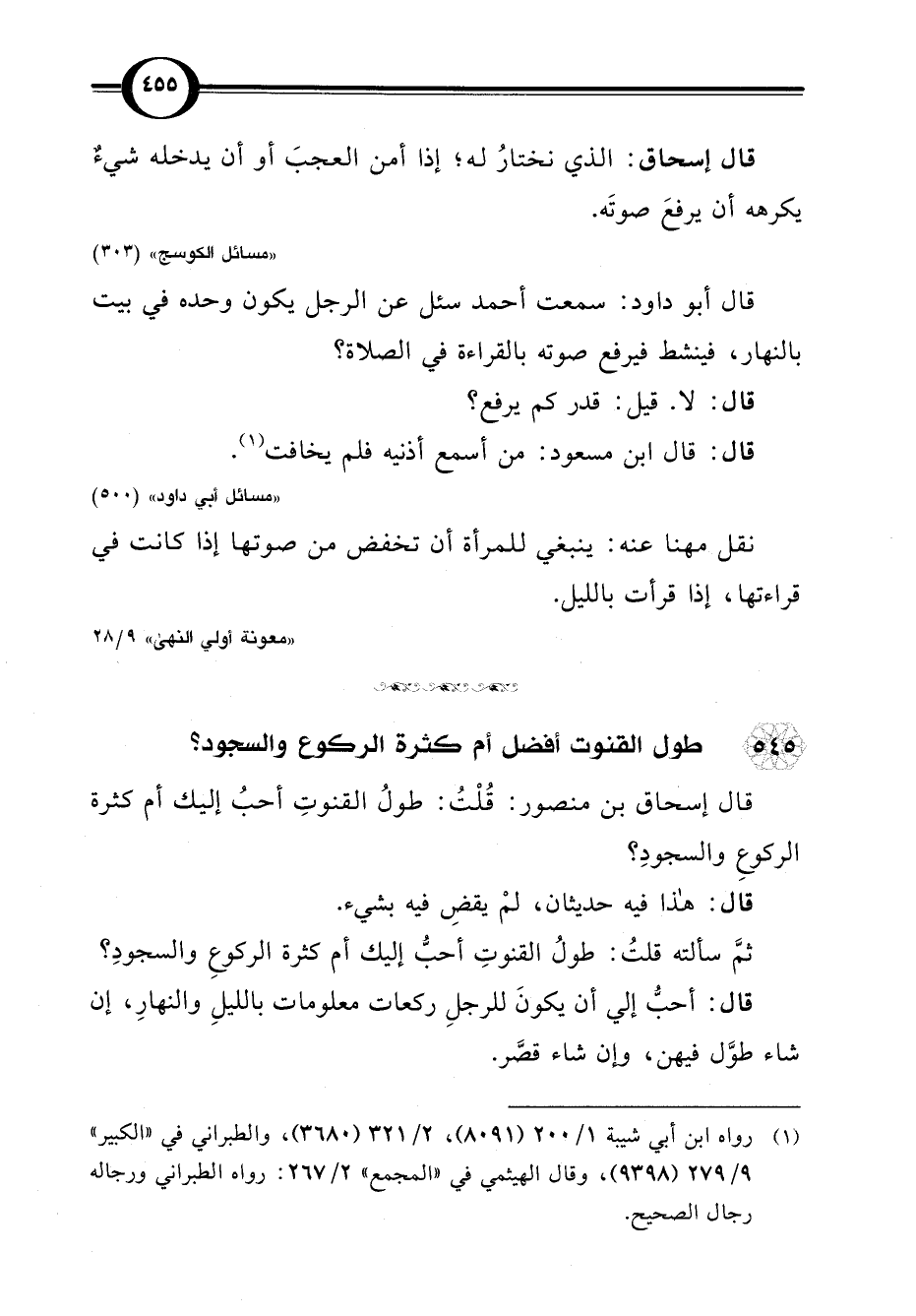 قال إسحاق بن منصور: قُلْتُ: طولُ القنوتِ أحبُ إليك أم كثرة الركوعِ والسجودِ؟