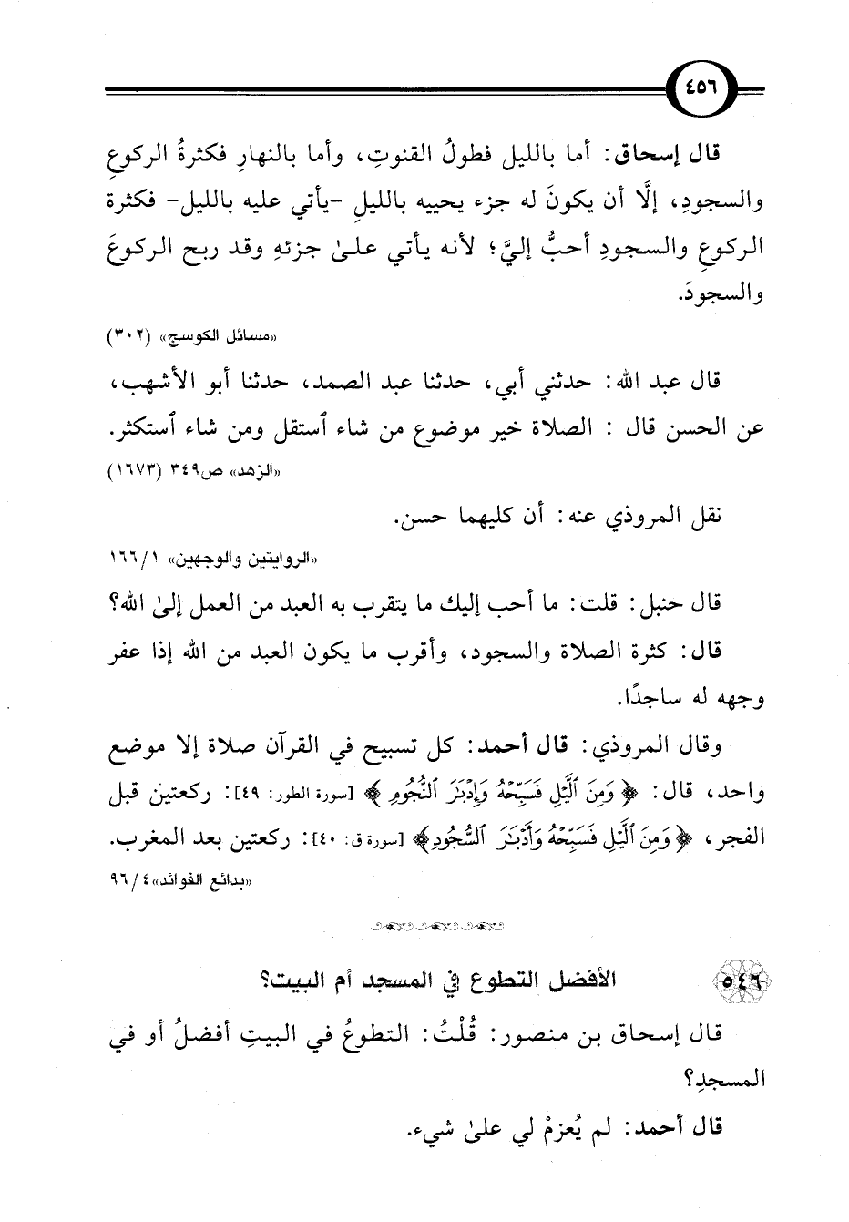 قال إسحاق بن منصور. قُلْتُ: التطوعُ في البيتِ أفضلُ أو في المسجدِ؟