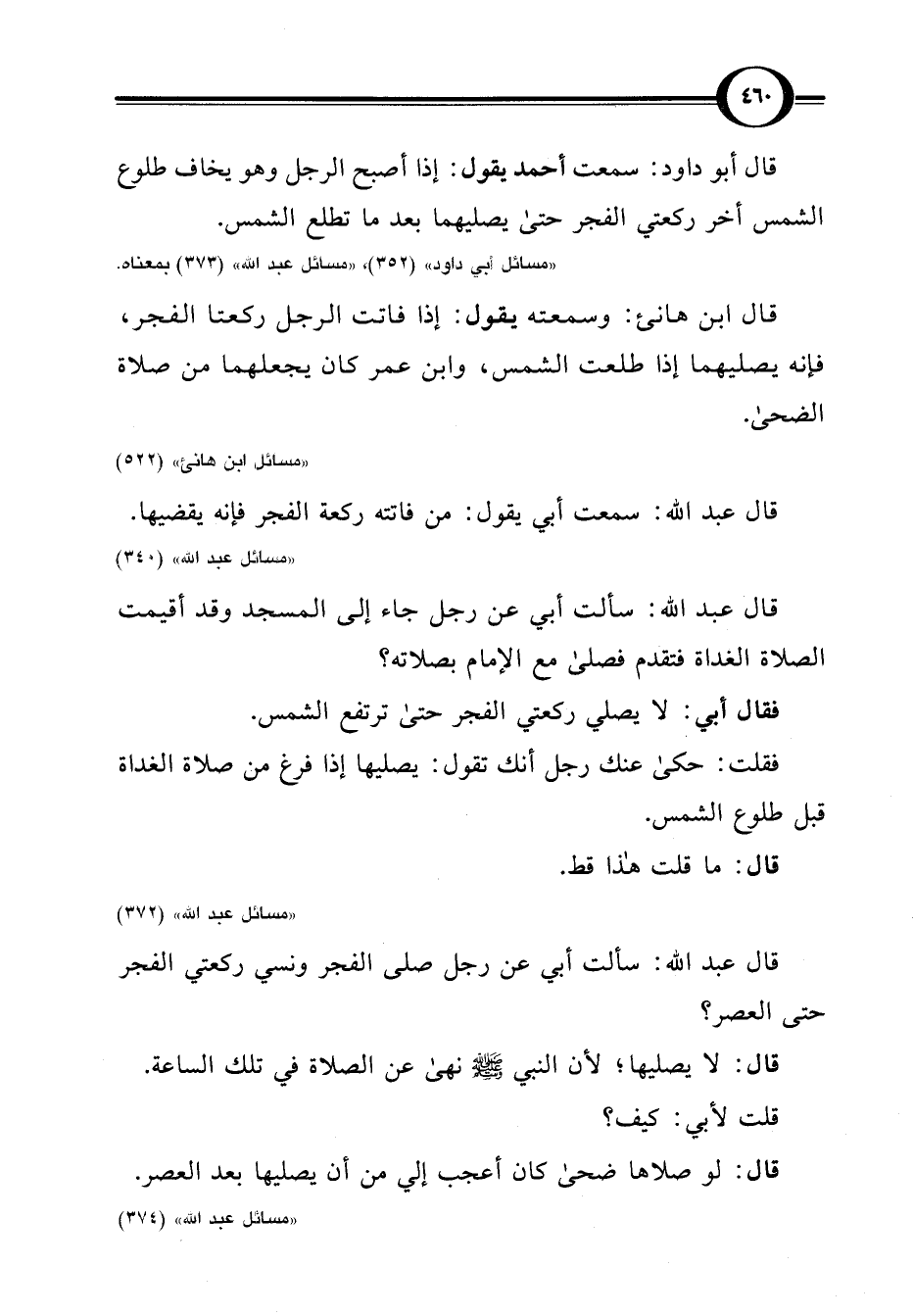 قال ابن هانئ: وسمعته يقول: إذا فاتت الرجل ركعتا الفجر، فمانه يصليهما إذا طلعت الشمس، وابن عمر كان يجعلهما من صلاة الضحى.