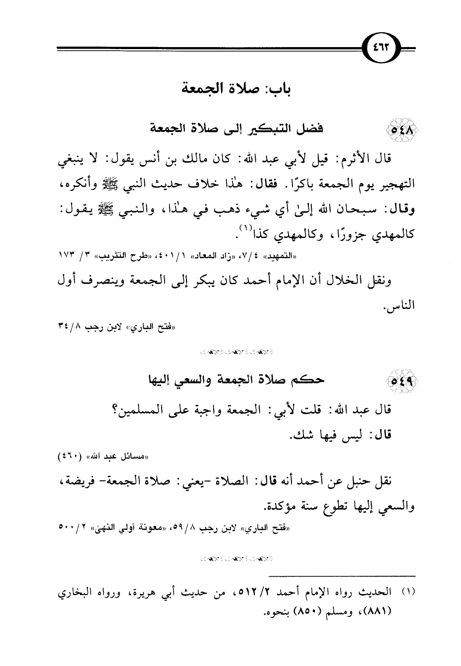 ونقل الخلال أن الإمام أحمد كان يبكر إلى الجمعة وينصرف أول الناس.