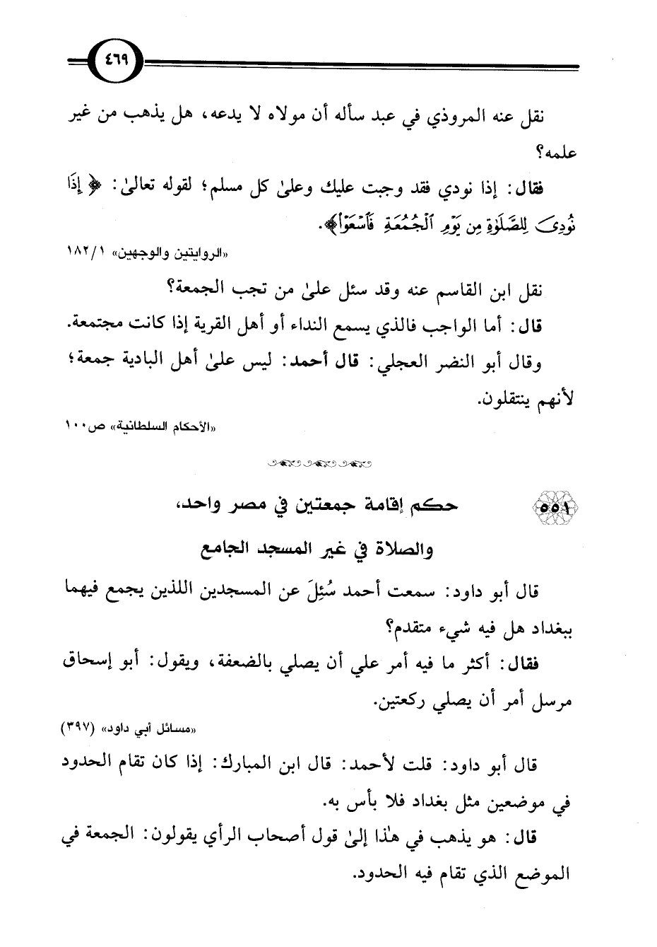 قال أبو داود: سمعت أحمد سُئِلَ عن المسجدين اللذين يجمع فيهما ببغداد هل فيه شيء متقدم؟