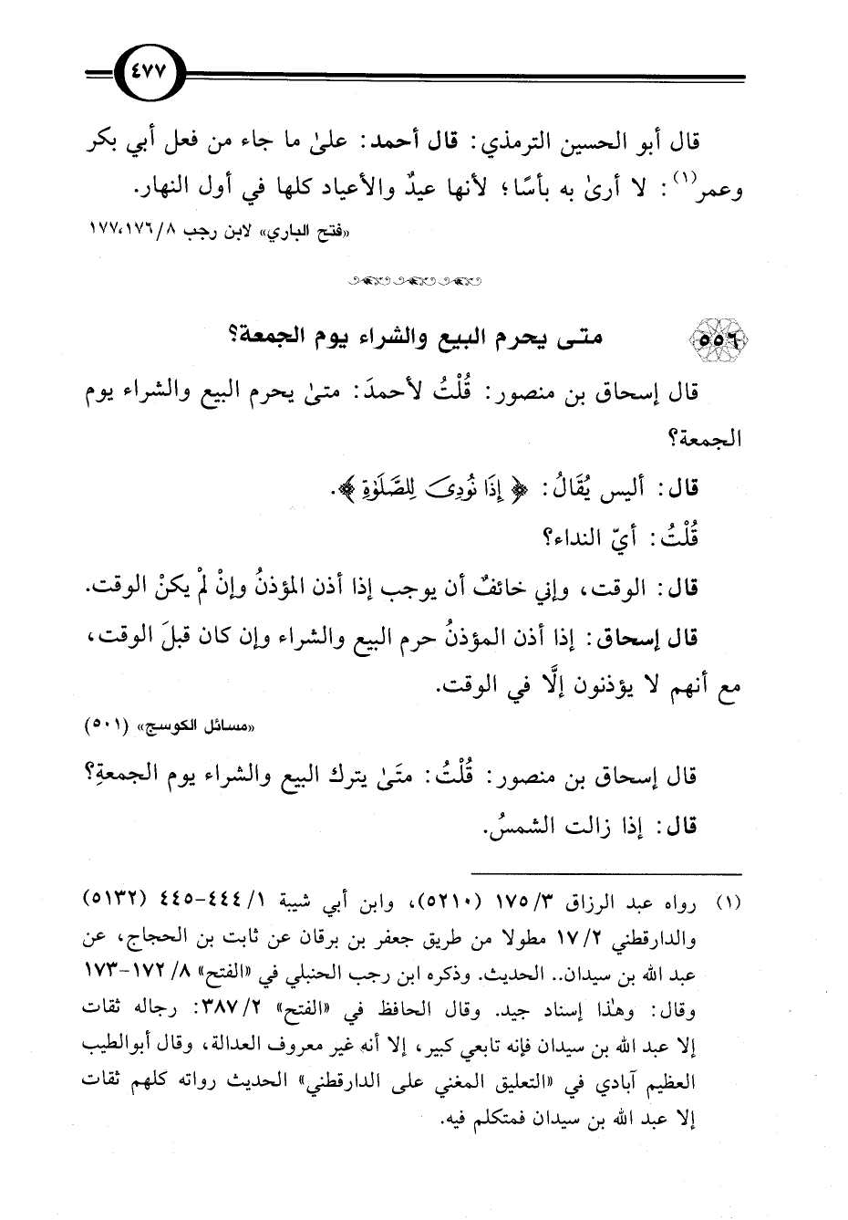 قال إسحاق بن منصور: قُلْتُ: متَى يترك البيع والشراء يوم الجمعةِ؟