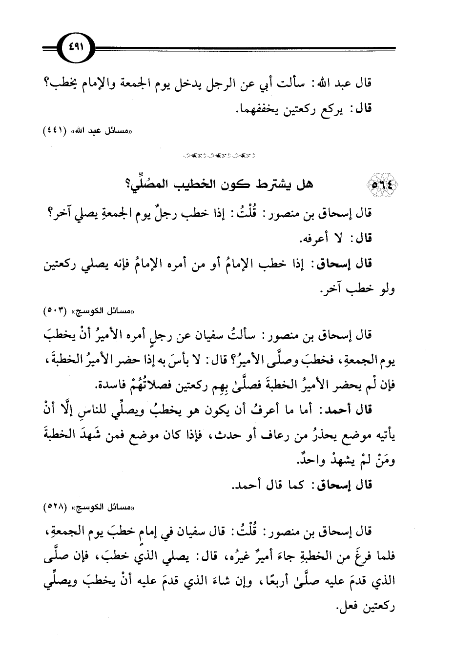قال إسحاق بن منصور: قُلْتُ: قال سفيان في إمامٍ خطبَ يوم الجمعةِ، فلما فرغَ من الخطبةِ جاءَ أميرٌ غيرُه، قال: يصلي الذي خطبَ، فإن صلَّى الذي قدمَ عليه صلَّى أربعًا، وإن شاءَ الذي قدمَ عليه أنْ يخطبَ ويصلِّي ركعتين فعل.