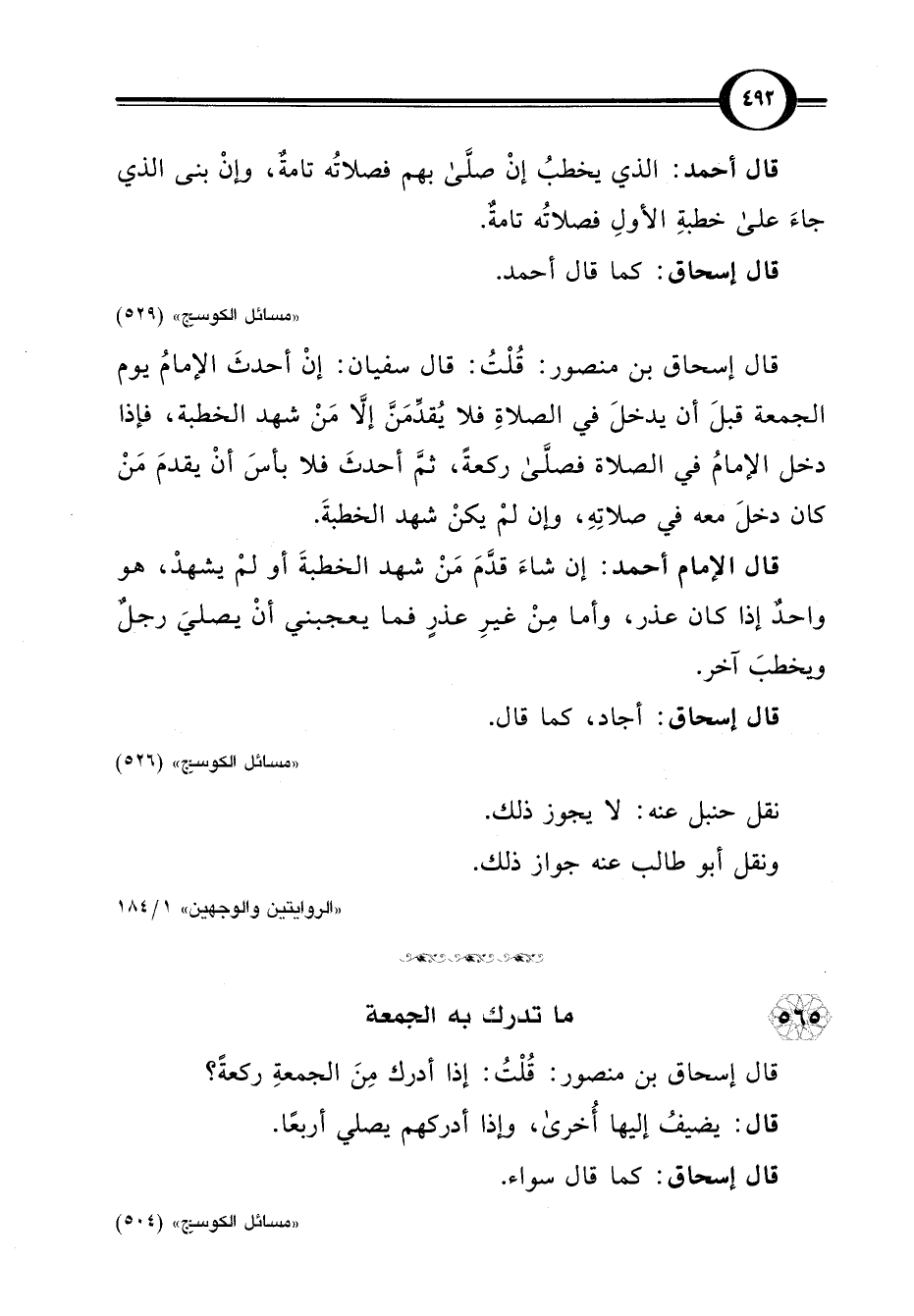 قال إسحاق بن منصور: قُلْتُ: قال سفيان: إنْ أحدثَ الإمامُ يوم الجمعة قبلَ أن يدخلَ في الصلاةِ فلا يُقدّمَنَّ إلَّا مَنْ شهد الخطبة، فإذا دخل الإمامُ في الصلاة فصلَّى ركعةً، ثمَّ أحدثَ فلا بأسَ أنْ يقدمَ مَنْ كان دخلَ معه في صلاتِهِ، وإن لمْ يكنْ شهد الخطبةَ.