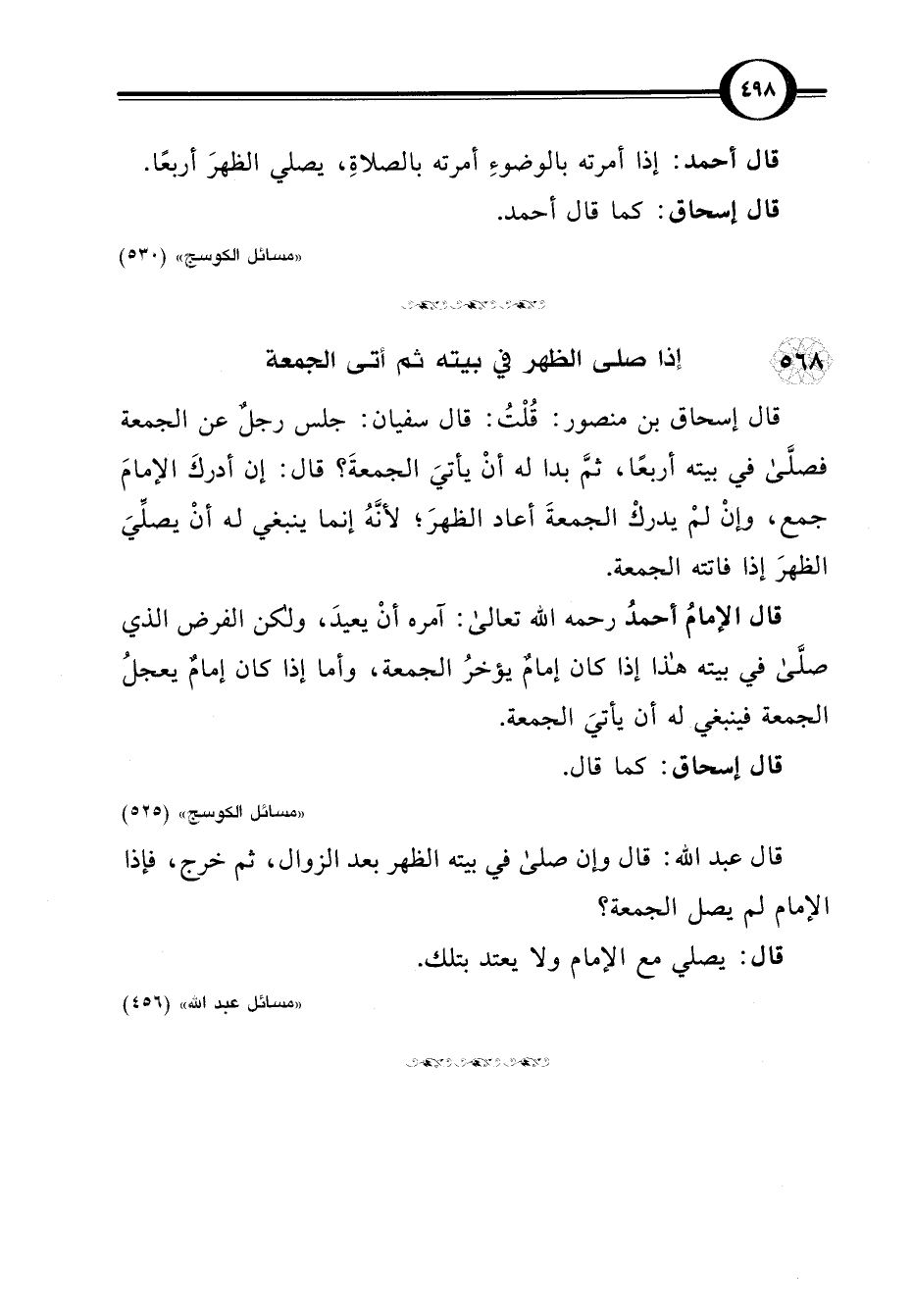 قال إسحاق بن منصور: قُلْتُ: قال سفيان: جلس رجلٌ عن الجمعة فصلَّى في بيته أربعًا، ثمَّ بدا له أنْ يأتيَ الجمعةَ؟ قال: إن أدركَ الإمامَ جمع، وإنْ لمْ يدركْ الجمعةَ أعاد الظهرَ؛ لأنَّهُ إنما ينبغي له أنْ يصفَيَ الظهرَ إذا فاتته الجمعة.