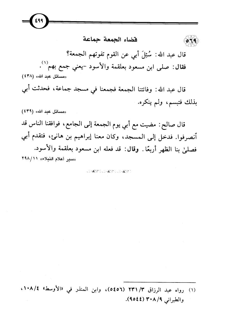 قال عبد اللَّه: وفاتتنا الجمعة فجمعنا في مسجد جماعة، فحدثت أبي بذلك تبسم، ولم ينكره.