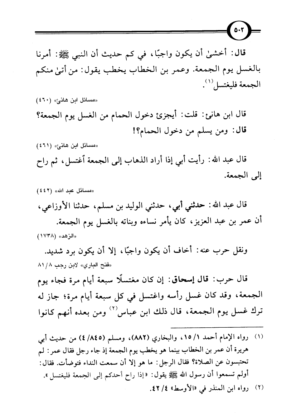 قال عبد اللَّه: رأيت أبي إذا أراد الذهاب إلى الجمعة اغتسل، ثم راح إلى الجمعة.