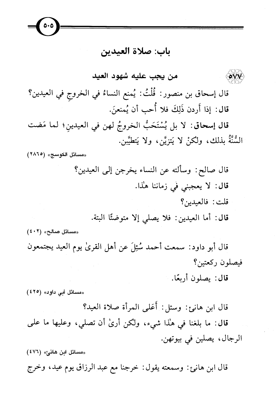 قال إسحاق بن منصور: قُلْتُ: يُمنع النساءُ في الخروجِ في العيدين؟