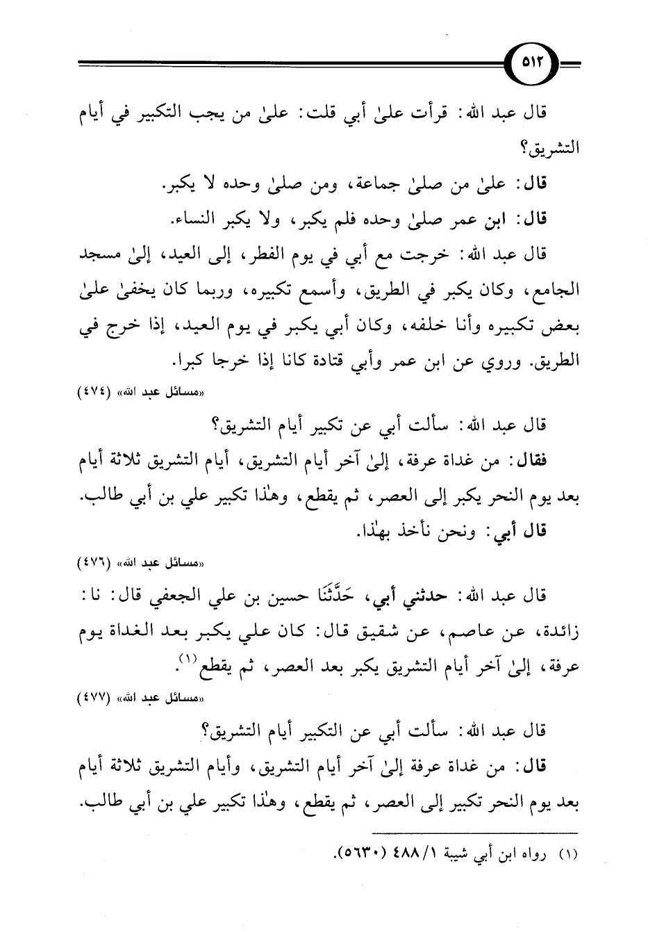 قال عبد اللَّه: سألت أبي عن التكبير أيام التشريق؟