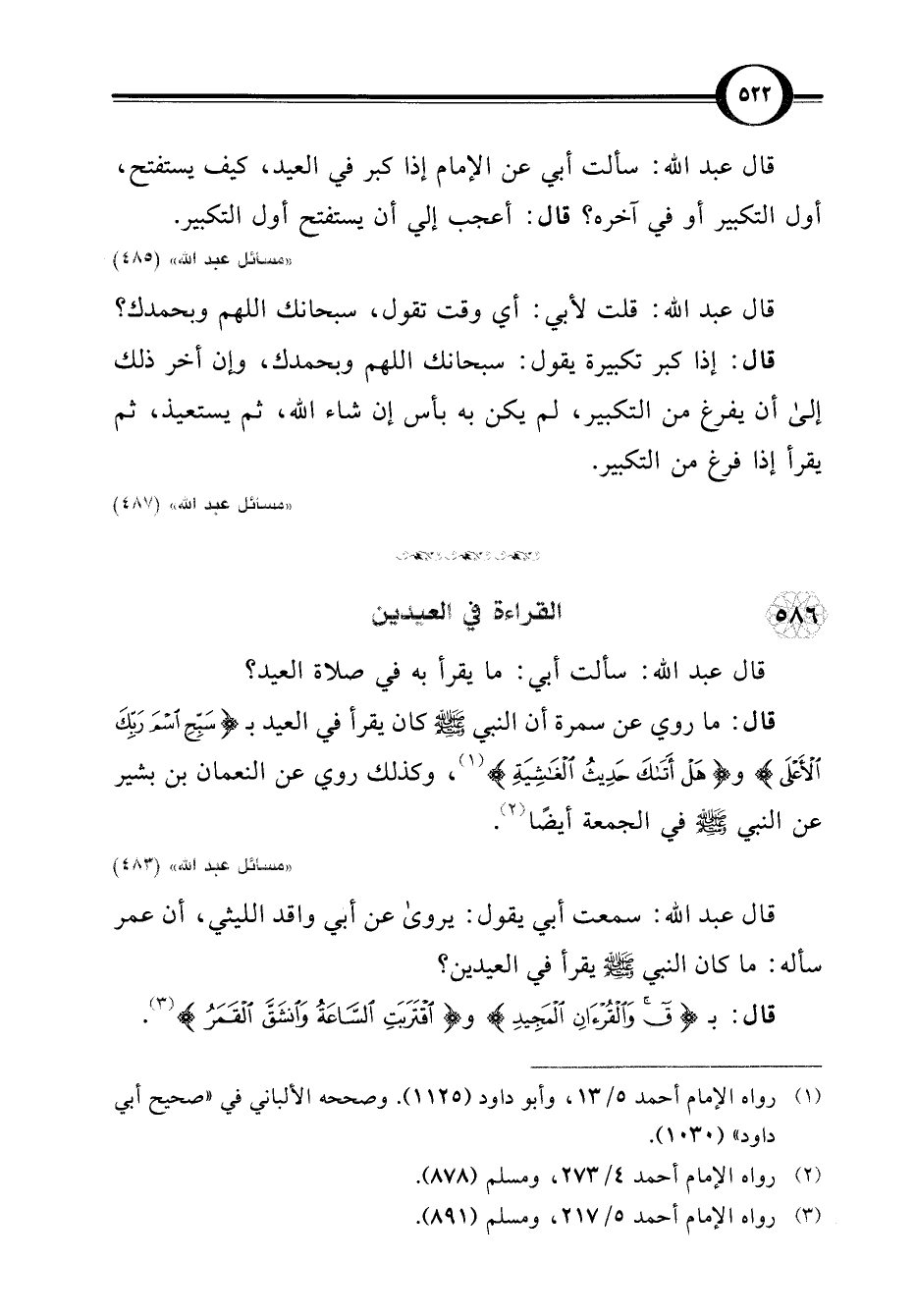 قال عبد اللَّه: سمعت أبي يقول: يروى عن أبي واقد الليثي، أن عمر سأله: ما كان النبي -صلى اللَّه عليه وسلم- يقرأ في العيدين؟