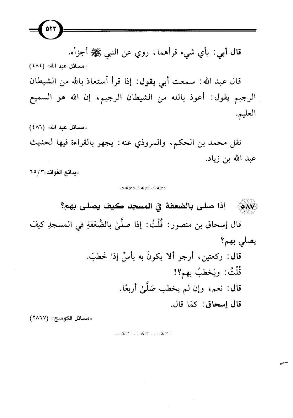 قال إسحاق بن منصور: قُلْتُ: إذا صلَّى بالضَّعَفةِ في المسجدِ كيفَ يصلي بهم؟