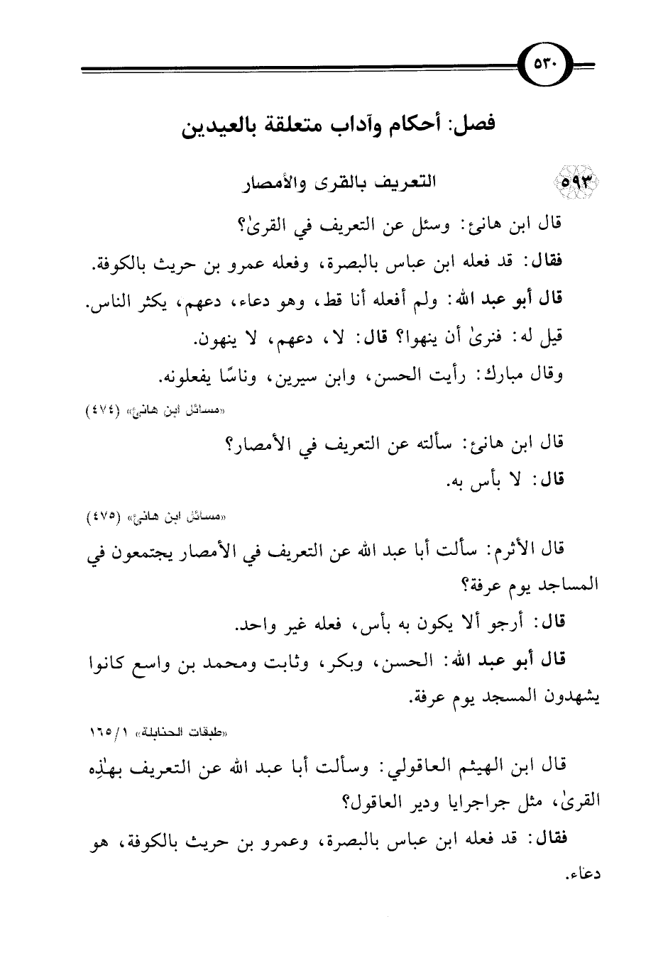 قال ابن هانئ: سألته عن التعريف في الأمصار؟