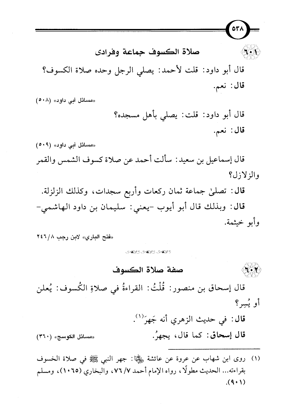 (¬1) روى ابن شهاب عن عروة عن عائشة -رضي اللَّه عنها-: جهر النبي -صلى اللَّه عليه وسلم- في صلاة الخسوف بقراءته. . . الحديث مطولًا، رواه الإمام أحمد 7/ 76، والبخاري (1065)، ومسلم (901).