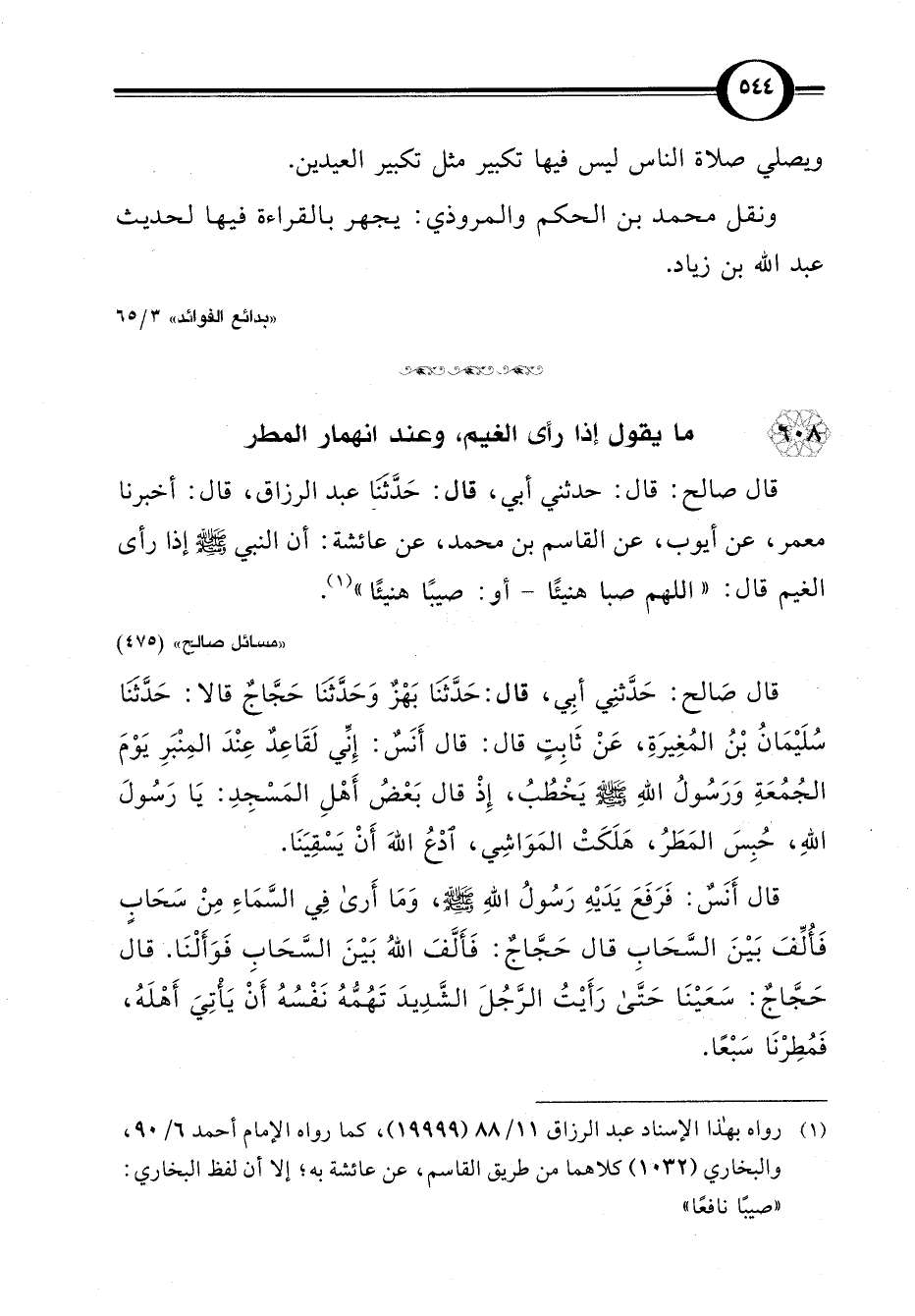 قال صالح: قال: حدثني أبي، قال: حَدَّثنَا عبد الرزاق، قال: أخبرنا معمر، عن أيوب، عن القاسم بن محمد، عن عائشة: أن النبي -صلى اللَّه عليه وسلم- إذا رأى الغيم قال: "اللهم صبا هنيئًا -أو: صيبًا هنيئًا" (¬1).