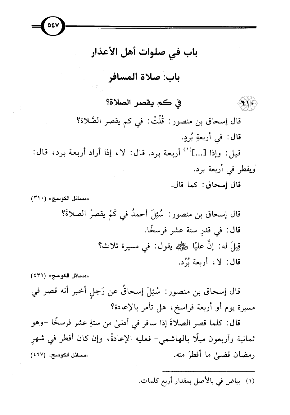 قال إسحاق بن منصور: قُلْتُ: في كم يقصر الصَّلاة؟