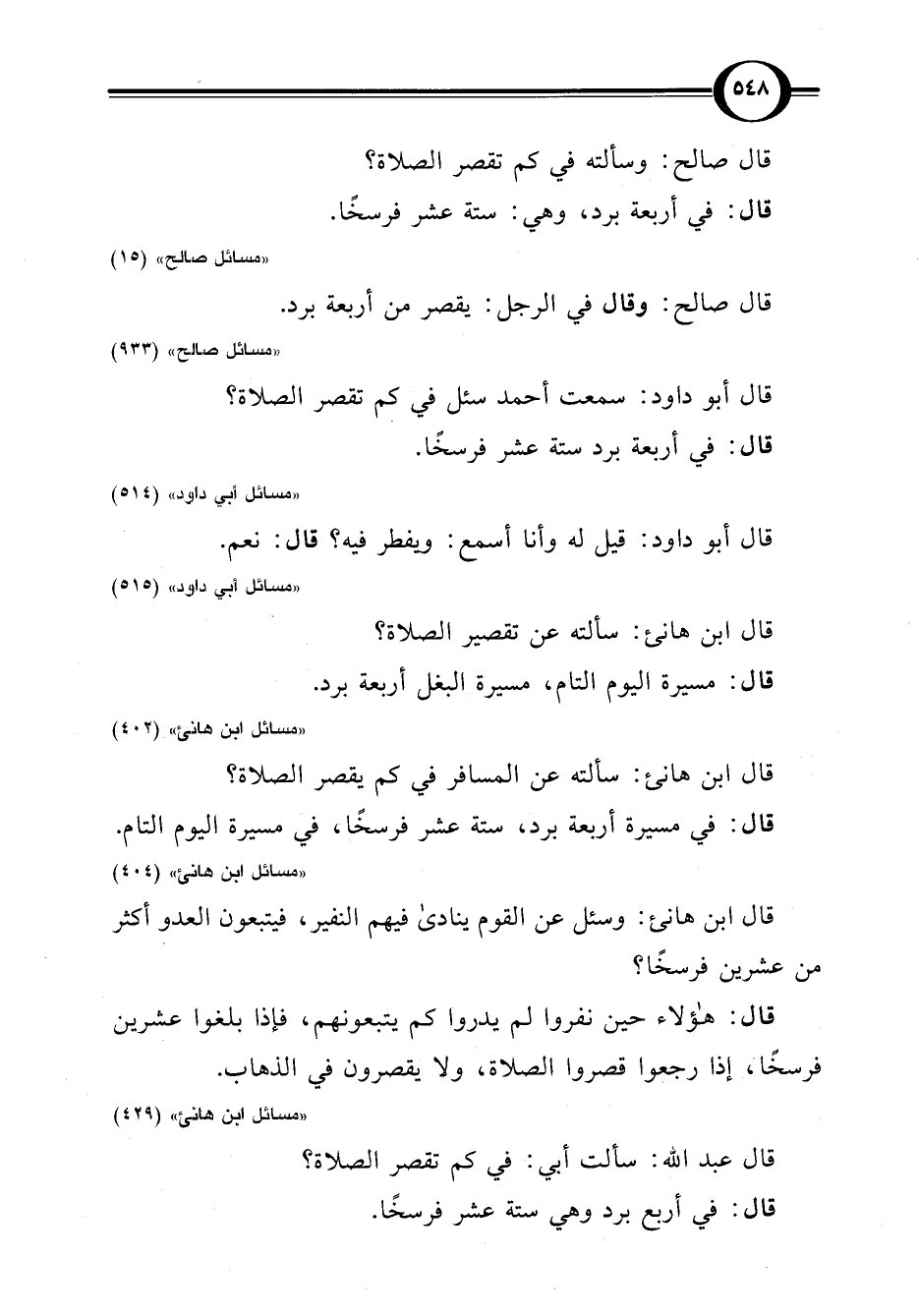 قال صالح: وسألته في كم تقصر الصلاة؟