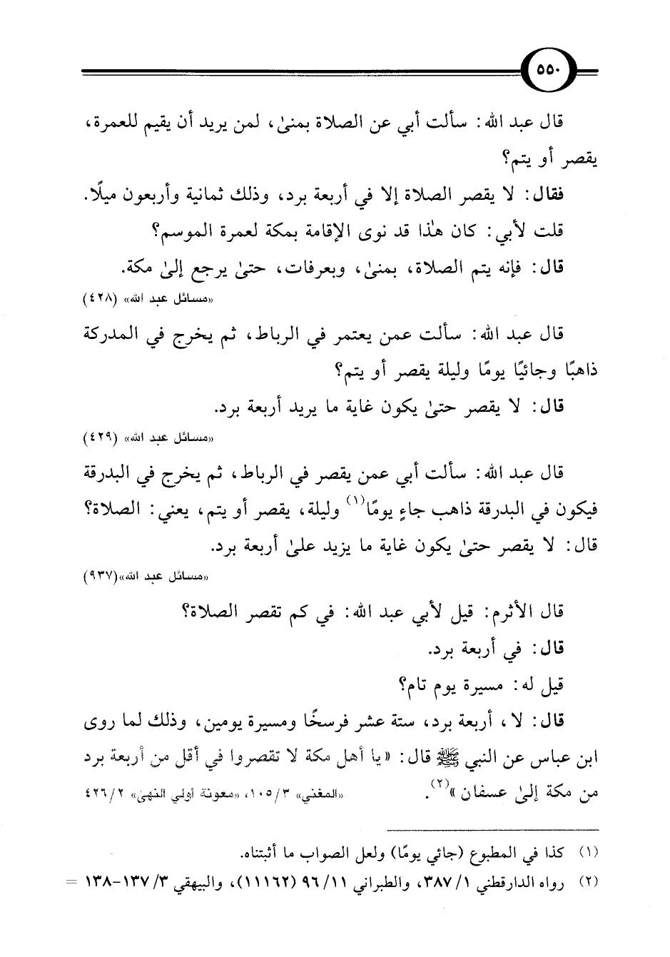قال عبد اللهْ سألت أبي عمن يقصر في الرباط، ثم يخرج في البدرقة فيكون في البدرقة ذاهب جاءٍ يومًا (¬1) وليلة، يقصر أو يتم، يعني: الصلاة؟ قال: لا يقصر حتى يكون غاية ما يزيد على أربعة برد.