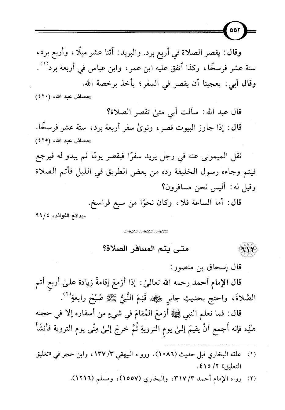 نقل الميموني عنه في رجل يريد سفرًا فيقصر يومًا ثم يبدو له فيرجع فيتم وجاءه رسول الخليفة رده من بعض الطريق في الليل فأتم الصلاة وقيل له: أليس نحن مسافرون؟