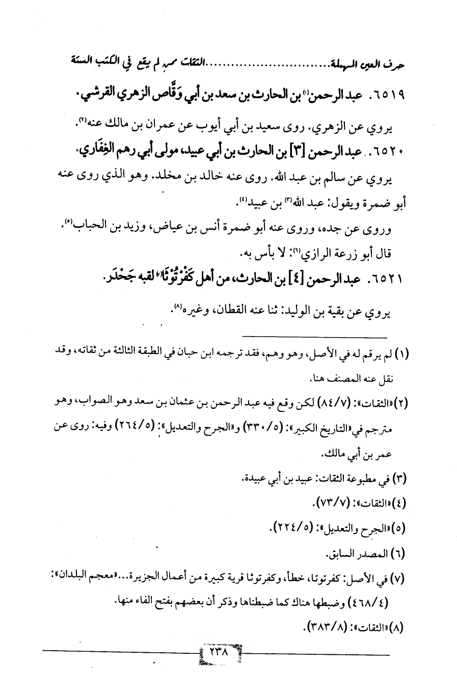6521 - عبد الرحمن [4] بن الحارث، من أهل كَفْرْتُوْثَا (¬7) لقبه جَحْدَر.