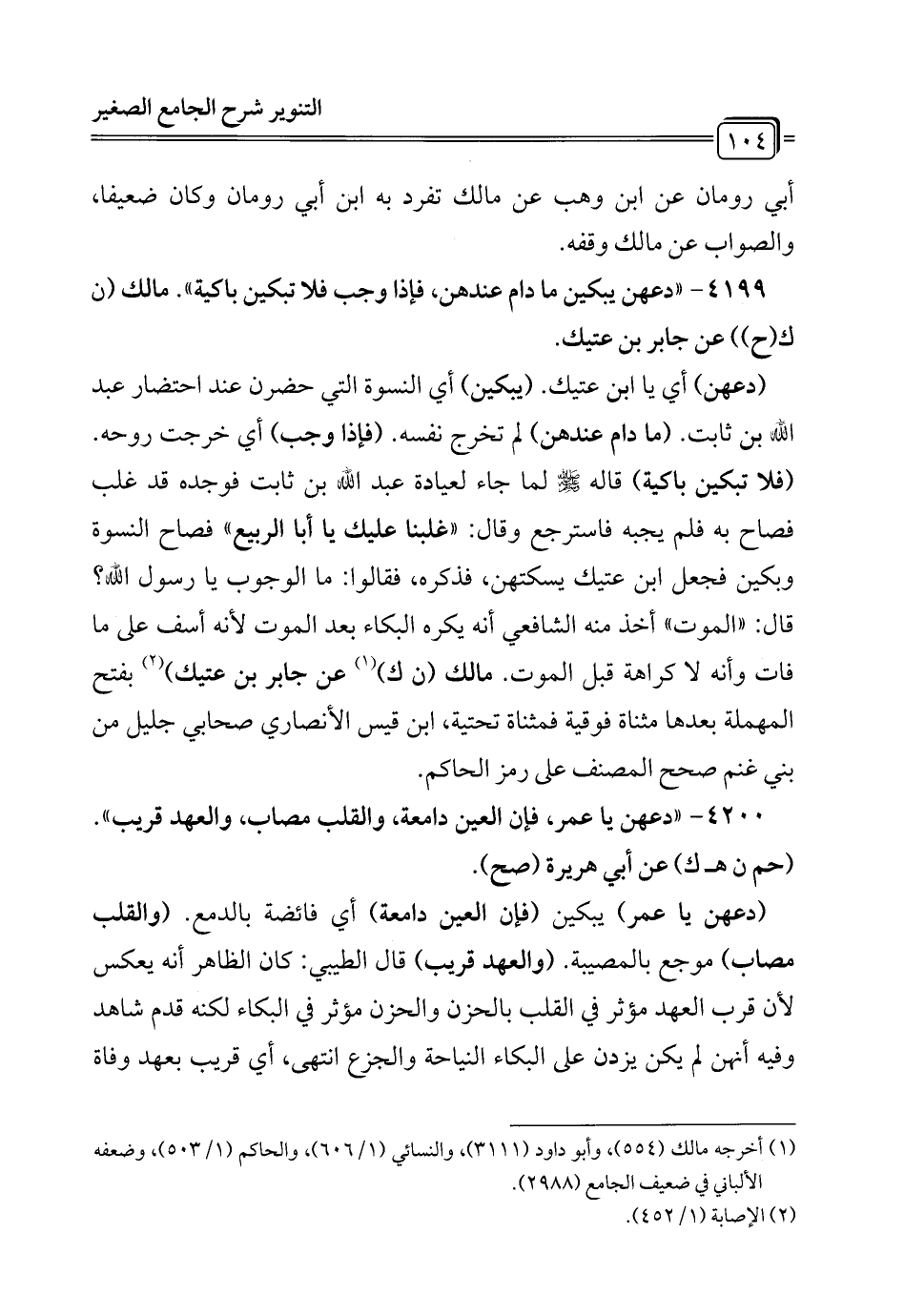 (دعهن) أي يا ابن عتيك. (يبكين) أي النسوة التي حضرن عند احتضار عبد الله بن ثابت. (ما دام عندهن) لم تخرج نفسه. (فإذا وجب) أي خرجت روحه. (فلا تبكين باكية) قاله - صلى الله عليه وسلم - لما جاء لعيادة عبد الله بن ثابت فوجده قد غلب فصاح به فلم يجبه فاسترجع وقال: "غلبنا عليك يا أبا الربيع" فصاح النسوة وبكين فجعل ابن عتيك يسكتهن، فذكره، فقالوا: ما الوجوب يا رسول الله؟ قال: "الموت" أخذ منه الشافعي أنه يكره البكاء بعد الموت لأنه أسف على ما فات وأنه لا كراهة قبل الموت. مالك (ن ك) (¬1) عن جابر بن عتيك) (¬2) بفتح المهملة بعدها مثناة فوقية فمثناة تحتية، ابن قيس الأنصاري صحابي جليل من بني غنم صحح المصنف على رمز الحاكم.
